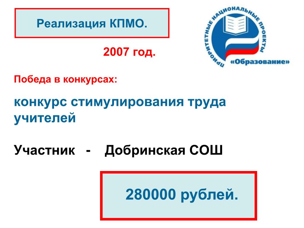 Реализация КПМО. 2007 год. Победа в конкурсах: конкурс стимулирования труда учителей Участник - Добринская СОШ 280000 рублей.