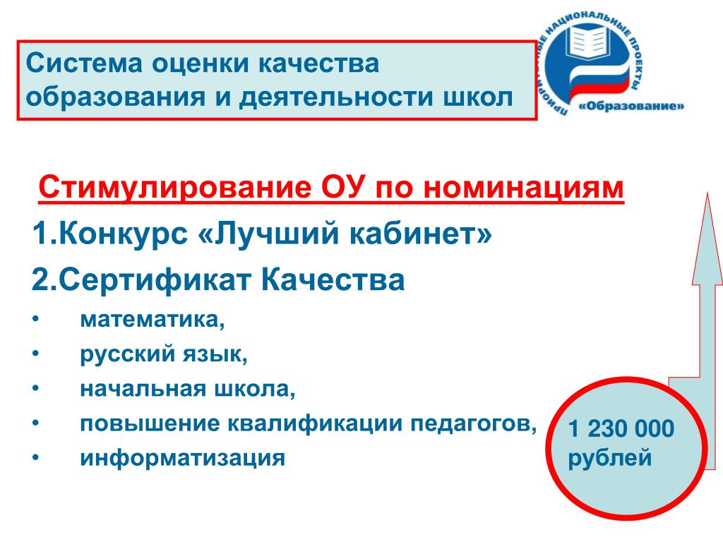 Система оценки качества образования и деятельности школ Стимулирование ОУ по номинациям 1.Конкурс «Лучший кабинет» 2.Сертификат Качества математика, русский язык, начальная школа, повышение квалификации педагогов, информатизация 1 230 000 рублей
