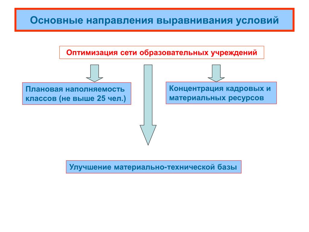 Основные направления выравнивания условий Оптимизация сети образовательных учреждений Концентрация кадровых и материальных ресурсов Плановая наполняемость классов (не выше 25 чел.) Улучшение материально-технической базы
