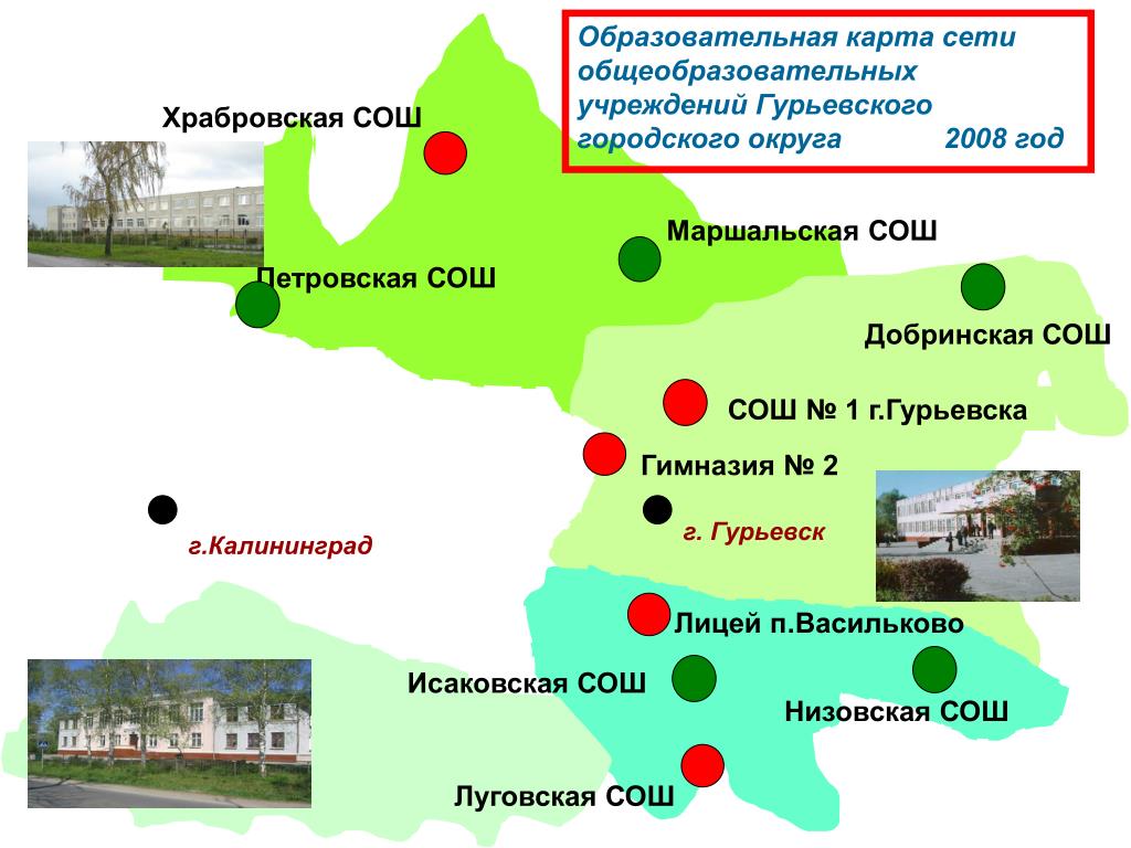 Образовательная карта сети общеобразовательных учреждений Гурьевского городского округа 2008 год Храбровская СОШ МаршальскаяСОШ Петровская СОШ Добринская СОШ СОШ № 1 г.Гурьевска Гимназия № 2 г. Гурьевск г.Калининград Лицей п.Васильково Исаковская СОШ Низовская СОШ Луговская СОШ