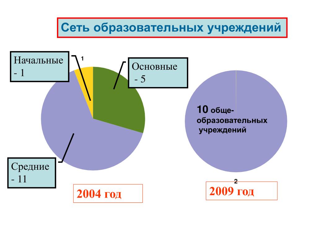 Сеть образовательных учреждений Начальные - 1 Основные - 5 10 обще- образовательных учреждений Средние - 11 2009 год 2004 год