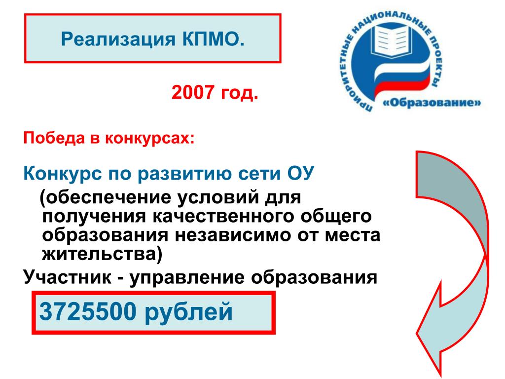 Реализация КПМО. 2007 год. Победа в конкурсах: Конкурс по развитию сети ОУ (обеспечение условий для получения качественного общего образования независимо от места жительства) Участник - управление образования 3725500 рублей