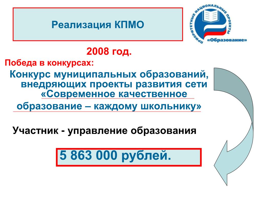 Реализация КПМО 2008 год. Победа в конкурсах: Конкурс муниципальных образований, внедряющих проекты развития сети«Современное качественное образование – каждому школьнику» Участник - управление образования 5 863 000 рублей.