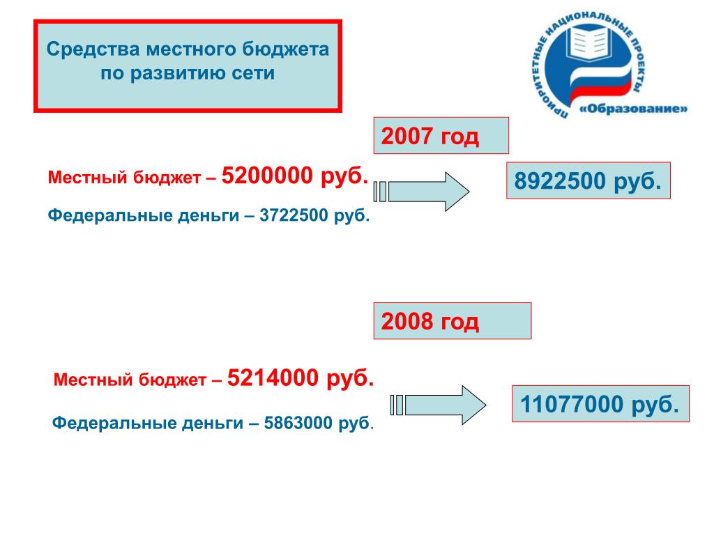 Средства местного бюджета по развитию сети 2007 год Местный бюджет – 5200000 руб. 8922500 руб. Федеральные деньги – 3722500 руб. 2008 год Местный бюджет – 5214000 руб. 11077000 руб. Федеральные деньги – 5863000 руб.