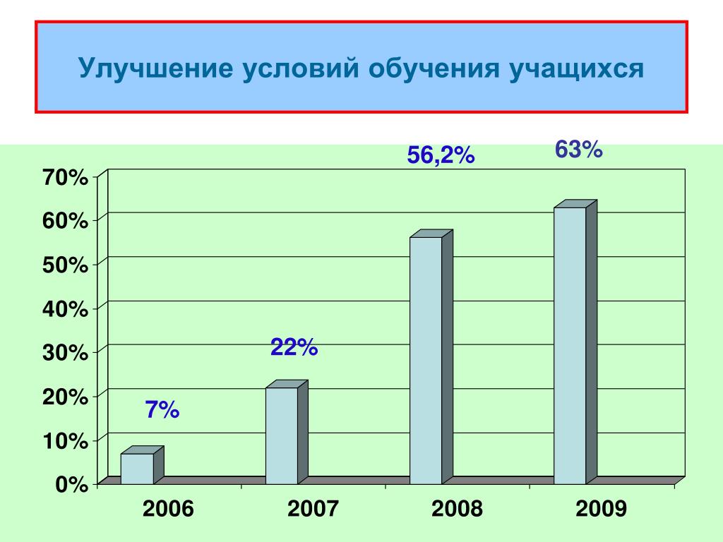 Улучшение условий обучения учащихся 63% 56,2% 22% 7%