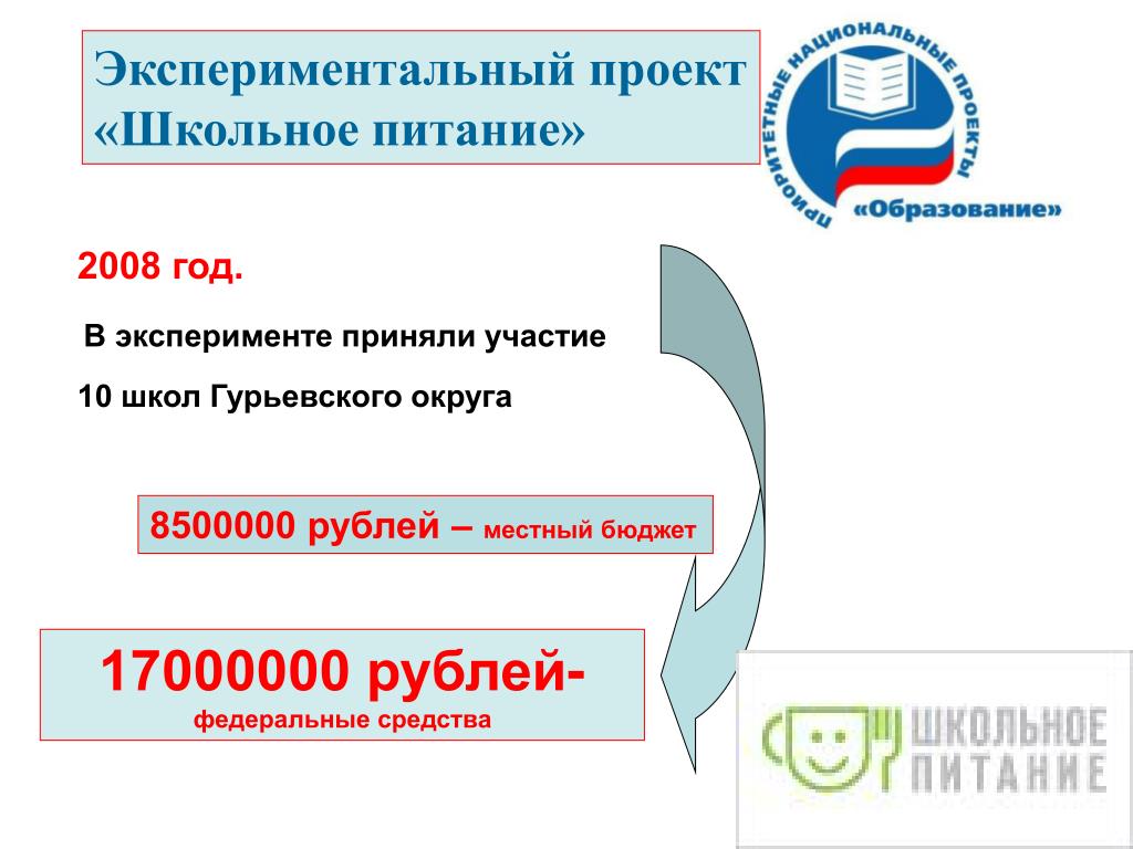 Экспериментальный проект «Школьное питание» 2008 год. В эксперименте приняли участие 10 школ Гурьевского округа 8500000 рублей – местный бюджет 17000000 рублей- федеральные средства