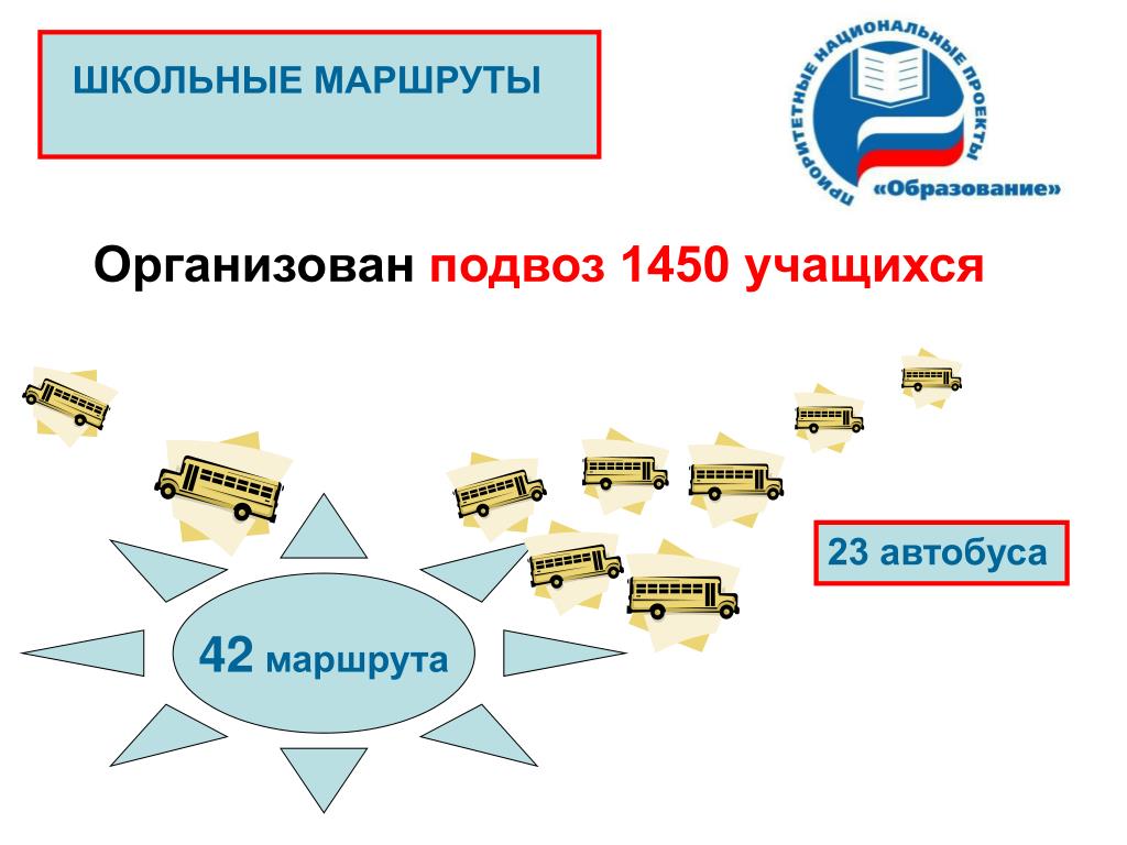 ШКОЛЬНЫЕ МАРШРУТЫ Организован подвоз 1450 учащихся 42 маршрута 23 автобуса