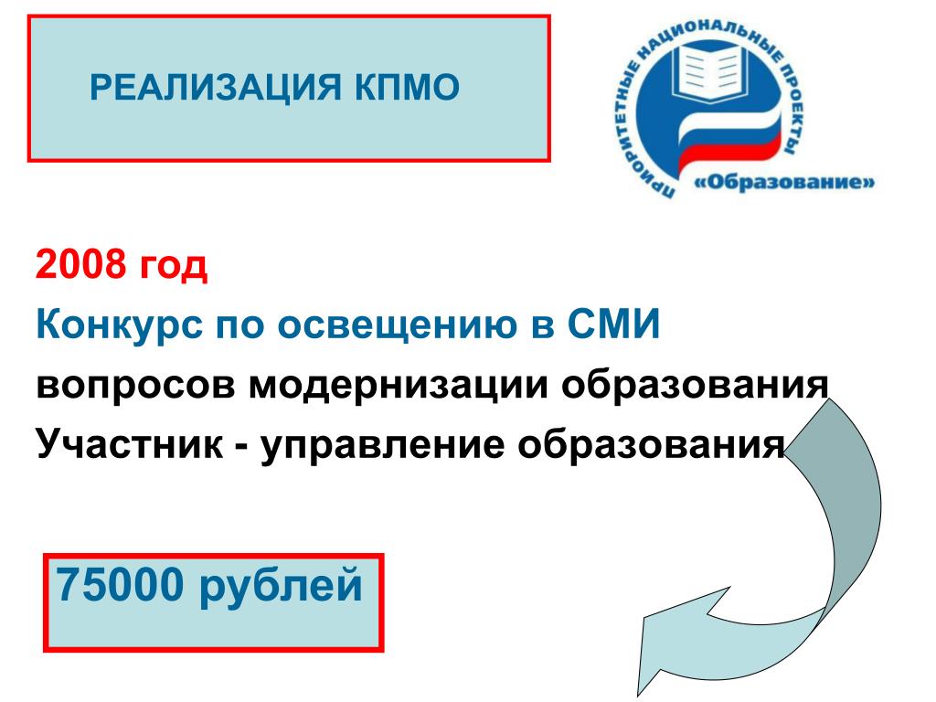 РЕАЛИЗАЦИЯ КПМО 2008 год Конкурс по освещению в СМИ вопросов модернизации образования Участник - управление образования 75000 рублей