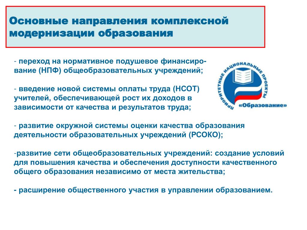 Основные направления комплексной модернизации образования • переход на нормативное подушевое финансиро- • вание (НПФ) общеобразовательных учреждений; • введение новой системы оплаты труда (НСОТ) • учителей, обеспечивающей рост их доходов в • зависимости от качества и результатов труда; • развитие окружной системы оценки качества образования деятельности образовательных учреждений (РСОКО); • развитие сети общеобразовательных учреждений: создание условий для повышения качества и обеспечения доступности качественного общего образования независимо от места жительства; • - расширение общественного участия в управлении образованием.