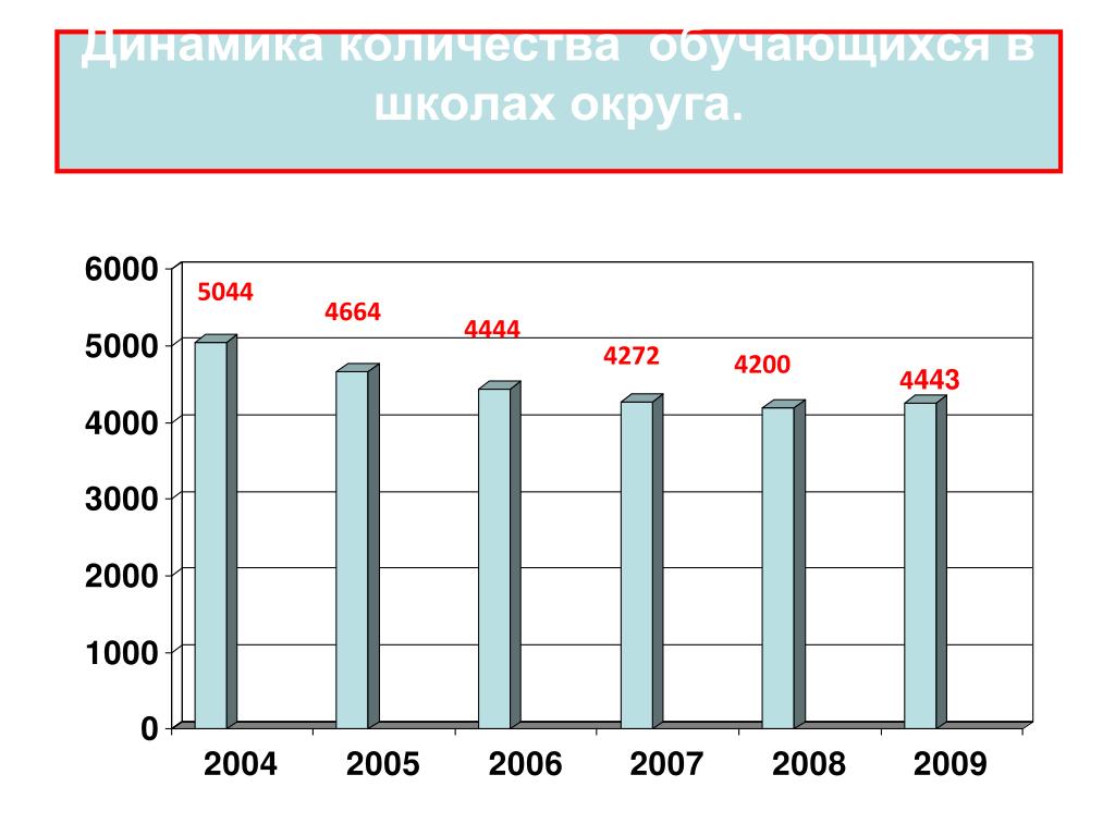 Динамика количества обучающихся в школах округа. 5044 4664 4444 4272 4200 4443