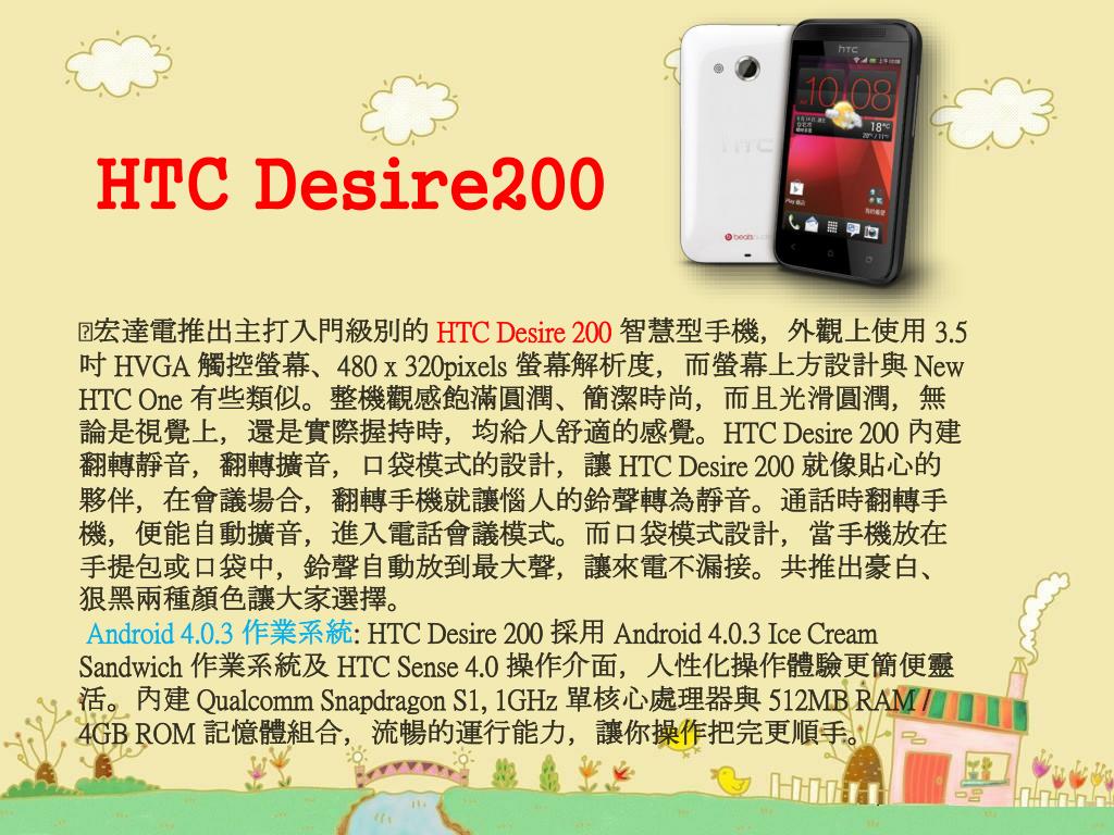 HTC Desire 系列. 班級 : 普二甲 組別 :26 組 學號 & 姓名 : 1010007 丁少淇 1010033 任盈伃 指導老師 : 高 瑜 鴻. HTC Desire200.