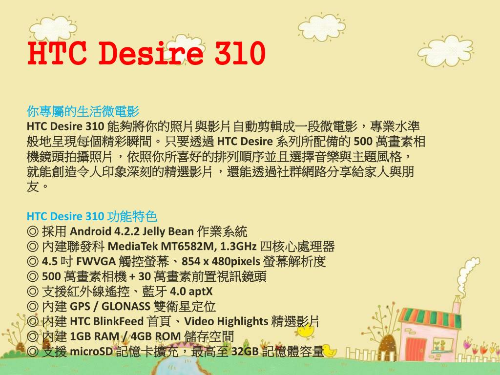 HTC Desire 310 你專屬的生活微電影 HTC Desire 310 能夠將你的照片與影片自動剪輯成一段微電影,專業水準般地呈現每個精彩瞬間。只要透過 HTC Desire 系列所配備的 500 萬畫素相機鏡頭拍攝照片,依照你所喜好的排列順序並且選擇音樂與主題風格,就能創造令人印象深刻的精選影片,還能透過社群網路分享給家人與朋友。 HTC Desire 310 功能特色 ◎ 採用 Android 4.2.2 Jelly Bean 作業系統◎ 內建聯發科MediaTek MT6582M, 1.3GHz 四核心處理器◎ 4.5 吋 FWVGA 觸控螢幕、854 x 480pixels 螢幕解析度◎ 500 萬畫素相機 + 30 萬畫素前置視訊鏡頭◎ 支援紅外線遙控、藍牙 4.0 aptX◎ 內建 GPS / GLONASS 雙衛星定位◎ 內建 HTC BlinkFeed首頁、Video Highlights 精選影片◎ 內建 1GB RAM / 4GB ROM 儲存空間◎ 支援microSD記憶卡擴充,最高至 32GB 記憶體容量