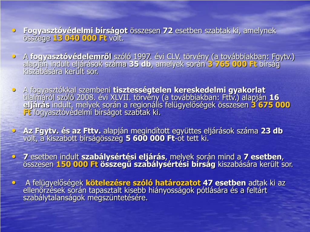 Fogyasztóvédelmi bírságot összesen 72 esetben szabtak ki, amelynek összege 13 040 000 Ft volt. • A fogyasztóvédelemről szóló 1997. évi CLV. törvény (a továbbiakban: Fgytv.) alapján indult eljárások száma 35 db, amelyek során 3 765 000 Ft bírság kiszabására került sor. • A fogyasztókkal szembeni tisztességtelen kereskedelmi gyakorlat tilalmáról szóló 2008. évi XLVII. törvény (a továbbiakban: Fttv.) alapján 16 eljárás indult, melyek során a regionális felügyelőségek összesen 3 675 000 Ft fogyasztóvédelmi bírságot szabtak ki. • Az Fgytv.és az Fttv. alapján megindított együttes eljárások száma 23 db volt, a kiszabott bírságösszeg 5 600 000 Ft-ot tett ki. • 7 esetben indult szabálysértési eljárás, melyek során mind a 7 esetben, összesen 150 000 Ft összegű szabálysértésibírság kiszabására került sor. • A felügyelőségek kötelezésre szóló határozatot 47 esetben adtak ki az ellenőrzések során tapasztalt kisebb hiányosságok pótlására és a feltárt szabálytalanságok megszüntetésére.