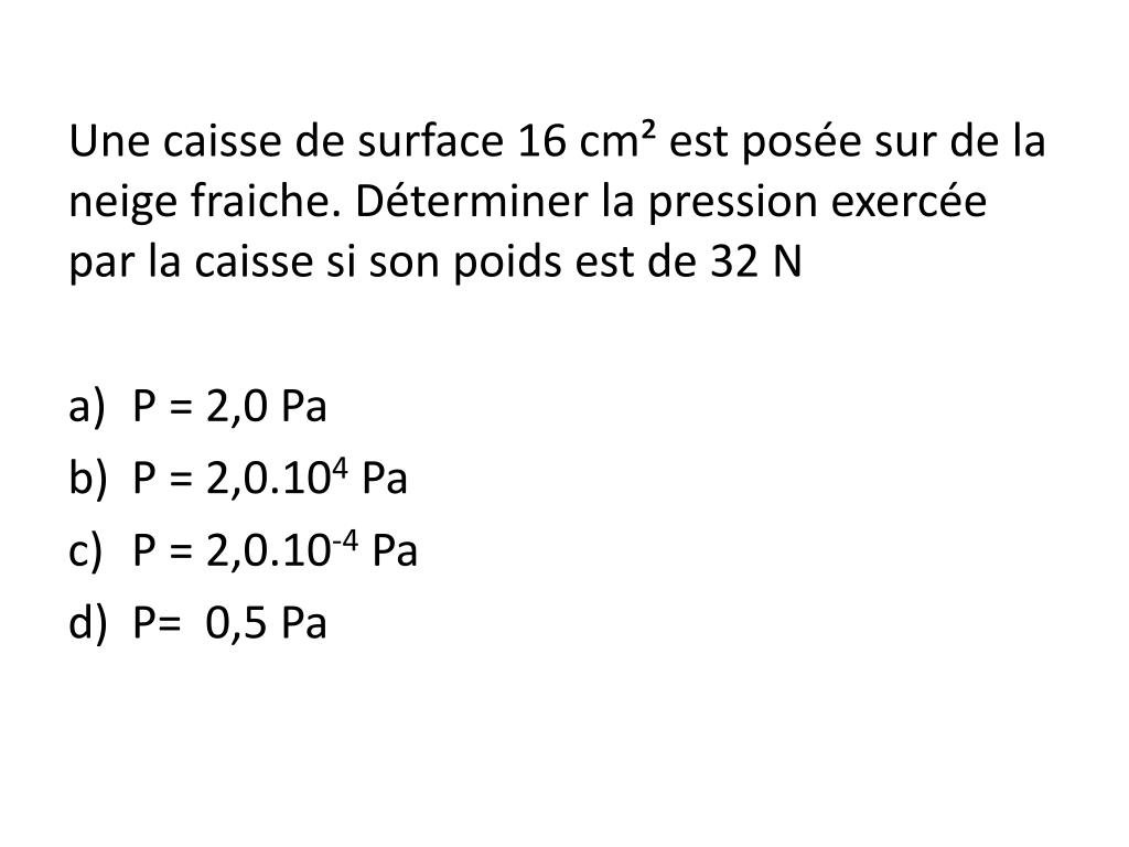 Une caisse de surface 16 cm² est posée sur de la neige fraiche. Déterminer la pression exercée par la caisse si son poids est de 32 N • P = 2,0 Pa • P = 2,0.104 Pa • P = 2,0.10-4 Pa • P= 0,5 Pa