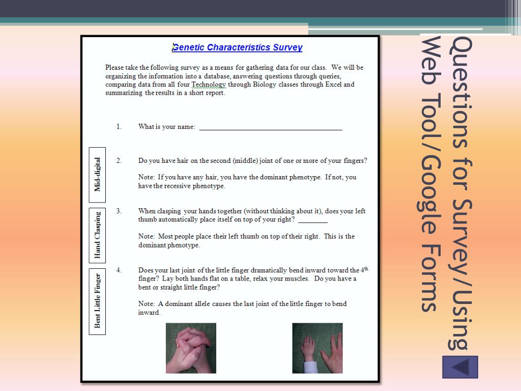 Utilizing Computer Programs– Example • Problem: What are the dominant inheritance traits in your students? • Process: Research for understanding, create important probing questions for survey, gather data, create database reports using important criteria, summarize. • Programs Used: • Google Search • Using important search words for understanding • Google Forms (Survey) • Access Database (query searching using criteria and reports) • Excel (gathering data) • Word (word processing for summarizing experience)