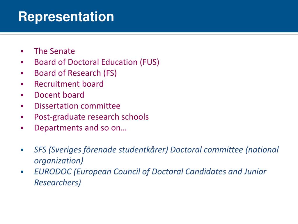 Representation • The Senate • Board of Doctoral Education (FUS) • Board of Research (FS) • Recruitment board • Docent board • Dissertation committee • Post-graduate research schools • Departments and so on… • SFS (Sverigesförenadestudentkårer) Doctoral committee (national organization) • EURODOC (European Council of Doctoral Candidates and Junior Researchers)
