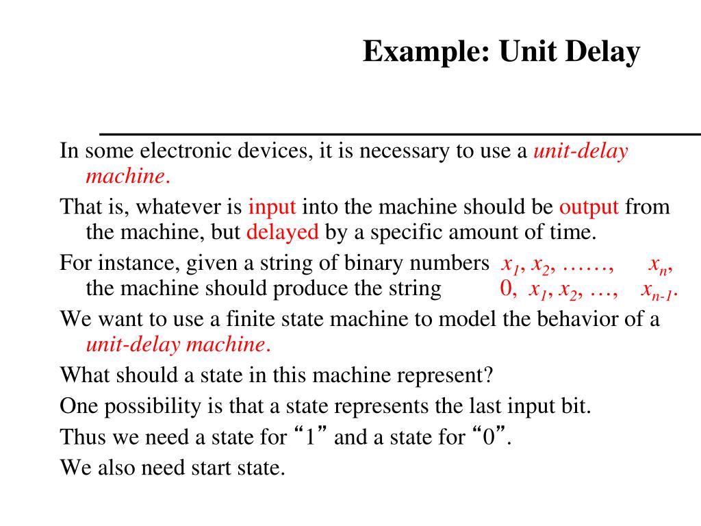 Example: Unit Delay • In some electronic devices, it is necessary to use a unit-delay machine. • That is, whatever is input into the machine should be output from the machine, but delayed by a specific amount of time. • For instance, given a string of binary numbers x1, x2, ……, xn, the machine should produce the string 0, x1, x2, …, xn-1. • We want to use a finite state machine to model the behavior of a unit-delay machine. • What should a state in this machine represent? • One possibility is that a state represents the last input bit. • Thus we need a state for “1” and a state for “0”. • We also need start state.