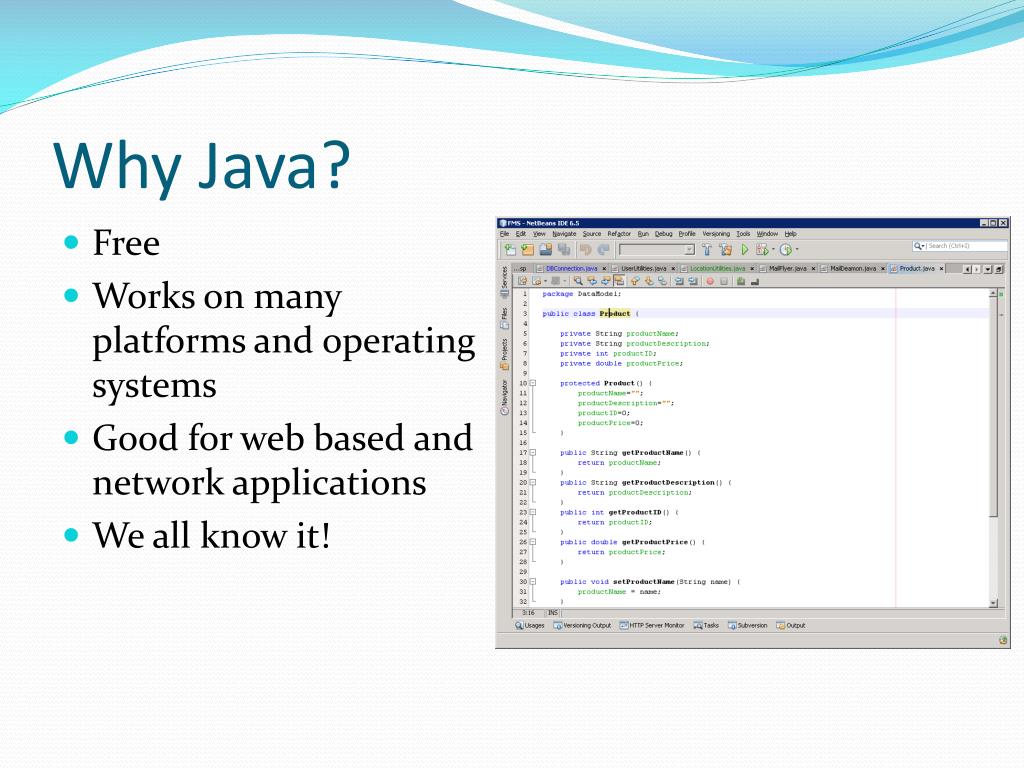 Why Java? • Free • Works on many platforms and operating systems • Good for web based and network applications • We all know it!