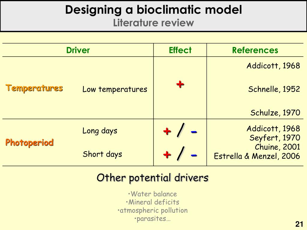 Designing a bioclimatic model Literature review • Other potential drivers • Water balance • Mineral deficits • atmospheric pollution • parasites… 21
