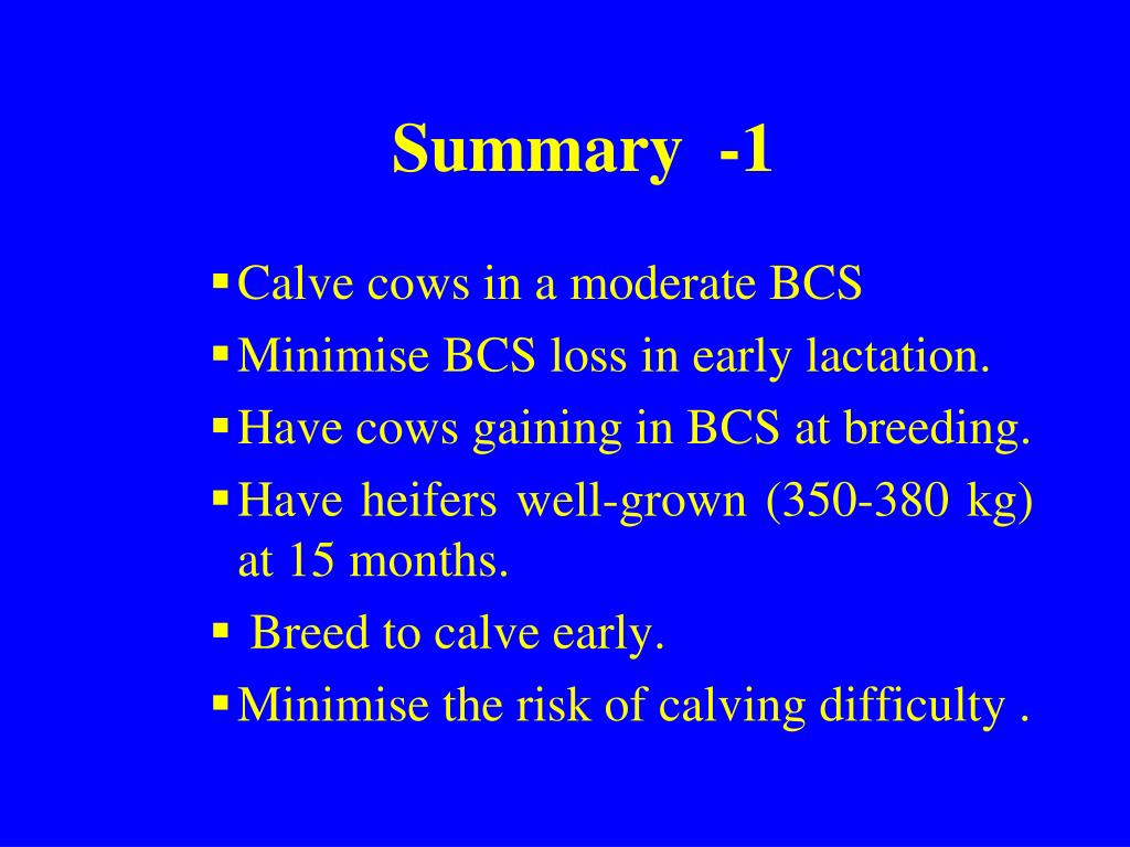 Summary -1 • Calve cows in a moderate BCS • Minimise BCS loss in early lactation. • Have cows gaining in BCS at breeding. • Have heifers well-grown (350-380 kg) at 15 months. • Breed to calve early. • Minimise the risk of calving difficulty .