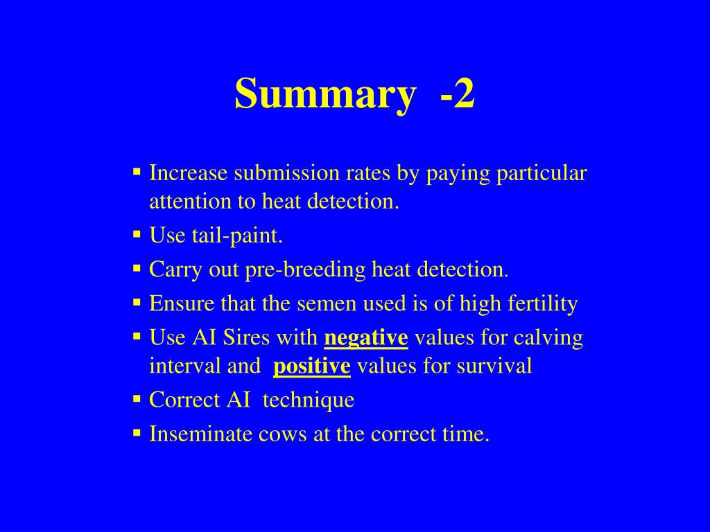Summary -2 • Increase submission rates by paying particular attention to heat detection. • Use tail-paint. • Carry out pre-breeding heat detection. • Ensure that the semen used is of high fertility • Use AI Sires with negative values for calving interval and positive values for survival • Correct AI technique • Inseminate cows at the correct time.