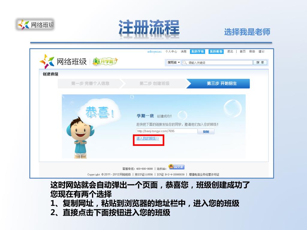 注册流程 选择我是老师 这时网站就会自动弹出一个页面,恭喜您,班级创建成功了 您现在有两个选择 1、复制网址,粘贴到浏览器的地址栏中,进入您的班级 2、直接点击下面按钮进入您的班级
