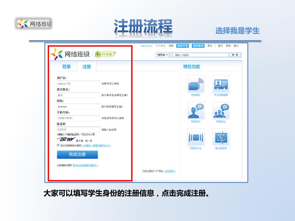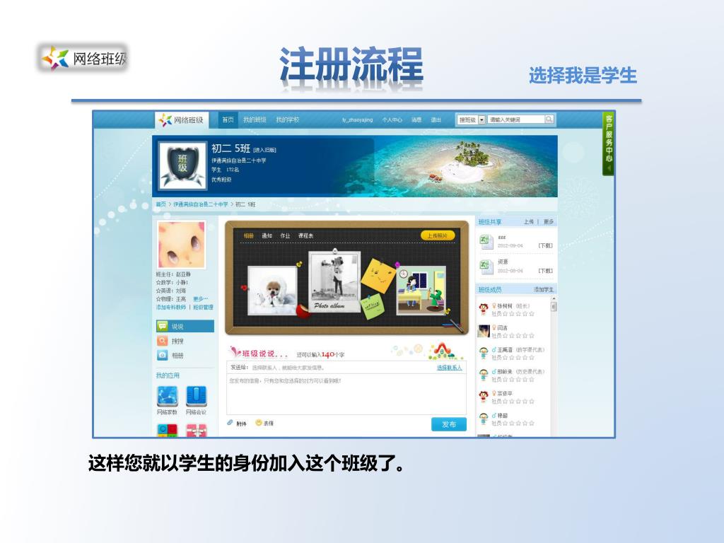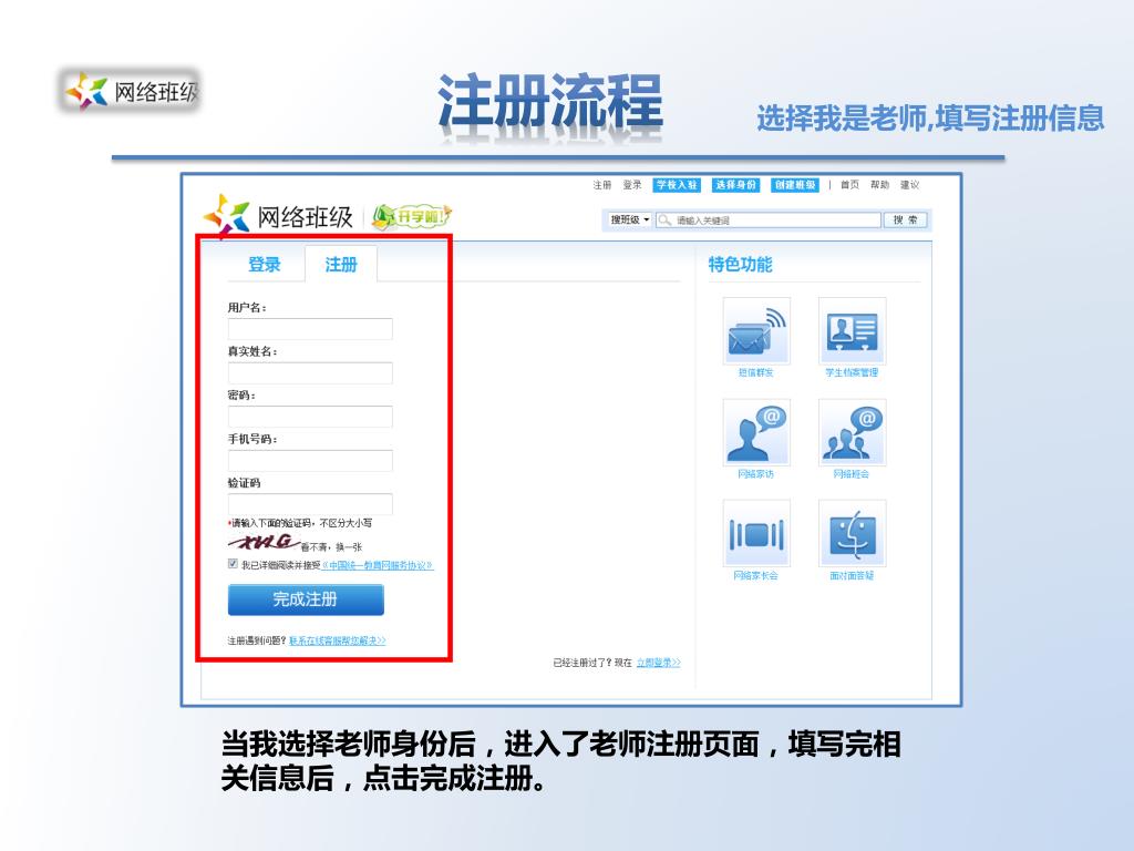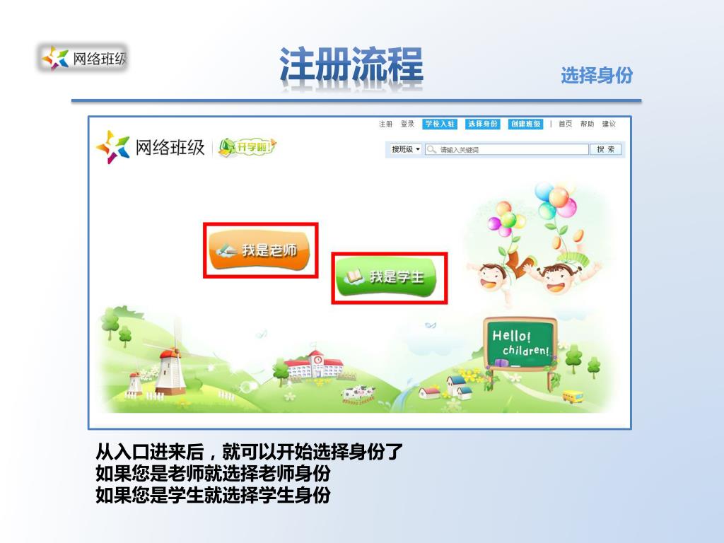 新版网络班级 产品 使用帮助 PPT1.3. 目录. 注册流程 班级的管理 班级成员管理,教师、学生的添加 黑板的使用 说说的使用 班级共享的使用 搜搜的使用 相册的使用 新版与旧版的切换 新的应用 —— 班级词典. 注册流程. 注册流程. 注册入口. 注册入口二:在会员登录区,点击轻松注册,只需 15 秒. 注册入口一:在网络班级网页头部,点击选择身份. 注册流程. 选择身份. 从入口进来后,就可以开始选择身份了 如果您是老师就选择老师身份 如果您是学生就选择学生身份. 注册流程. 选择我是老师 , 填写注册信息.