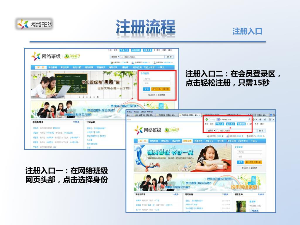 注册流程 注册入口 注册入口二:在会员登录区,点击轻松注册,只需15秒 注册入口一:在网络班级网页头部,点击选择身份