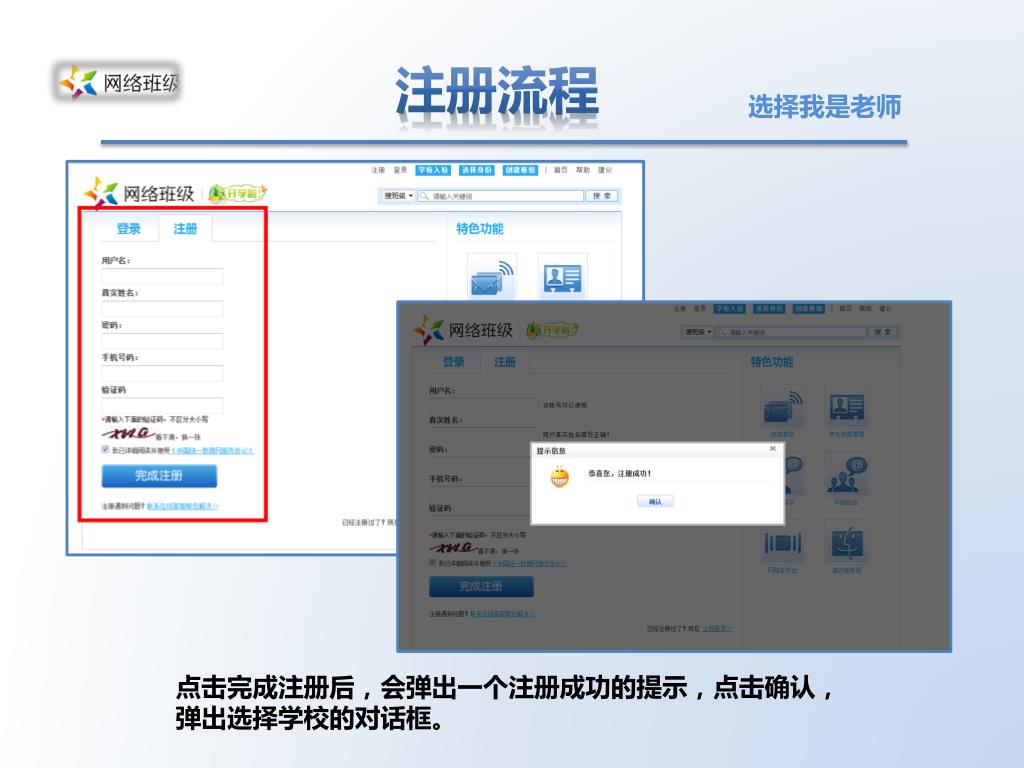 注册流程 选择我是老师 点击完成注册后,会弹出一个注册成功的提示,点击确认, 弹出选择学校的对话框。