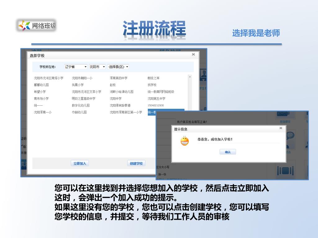注册流程 选择我是老师 您可以在这里找到并选择您想加入的学校,然后点击立即加入 这时,会弹出一个加入成功的提示。 如果这里没有您的学校,您也可以点击创建学校,您可以填写 您学校的信息,并提交,等待我们工作人员的审核