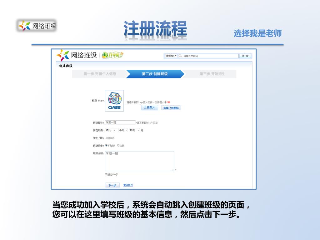 注册流程 选择我是老师 当您成功加入学校后,系统会自动跳入创建班级的页面, 您可以在这里填写班级的基本信息,然后点击下一步。