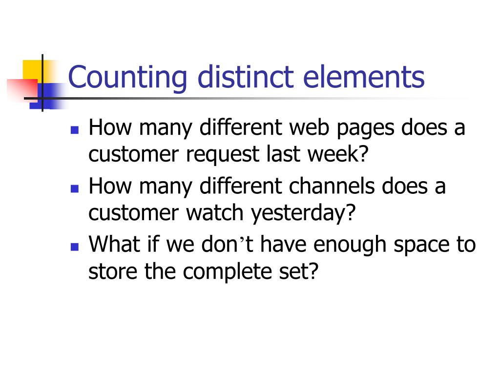 Counting distinct elements • How many different web pages does a customer request last week? • How many different channels does a customer watch yesterday? • What if we don’t have enough space to store the complete set?