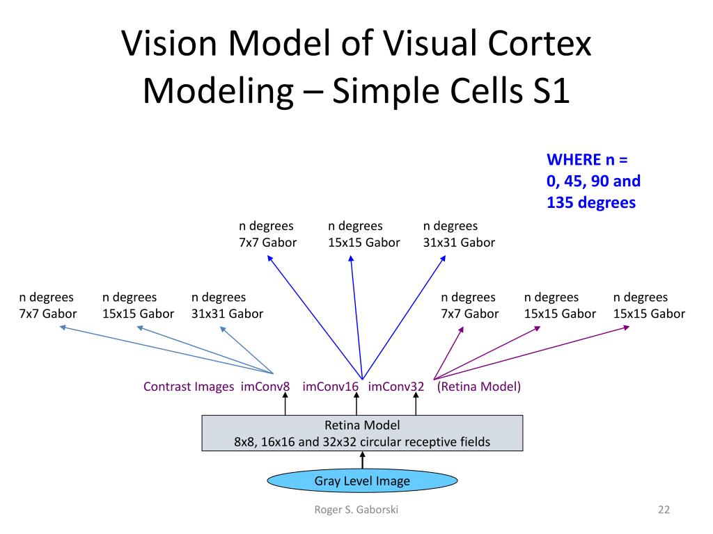 Vision Model of Visual Cortex Modeling – Simple Cells S1 WHERE n = 0, 45, 90 and 135 degrees n degrees 7x7 Gabor n degrees 15x15 Gabor n degrees 31x31 Gabor n degrees 7x7 Gabor n degrees 15x15 Gabor n degrees 31x31 Gabor n degrees 7x7 Gabor n degrees 15x15 Gabor n degrees 15x15 Gabor Contrast Images imConv8 imConv16 imConv32 (Retina Model) Retina Model 8x8, 16x16 and 32x32 circular receptive fields Gray Level Image Roger S. Gaborski