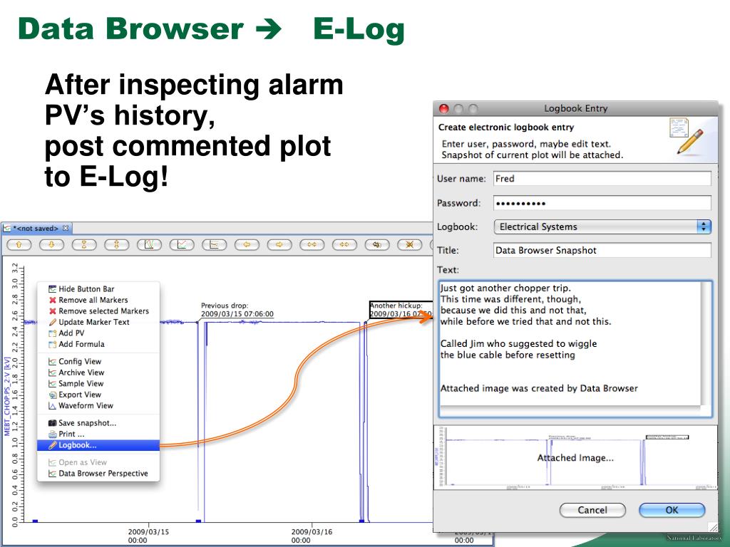 Data Browser E-Log After inspecting alarm PV’s history,post commented plotto E-Log!