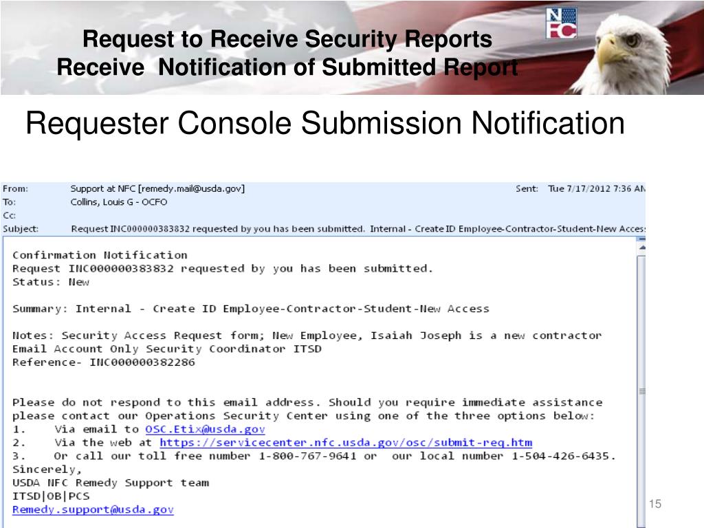 Request to Receive Security ReportsReceive Notification of Submitted Report Requester Console Submission Notification