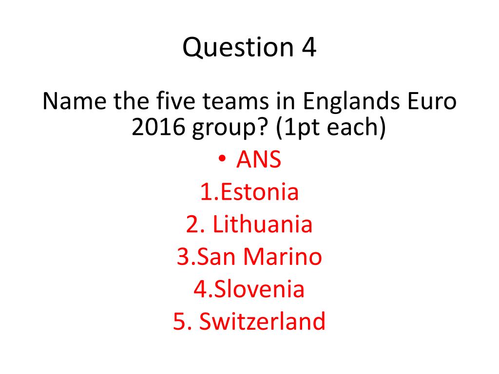 Question 4 Name the five teams in Englands Euro 2016 group? (1pt each) • ANS 1.Estonia 2. Lithuania 3.San Marino 4.Slovenia 5. Switzerland