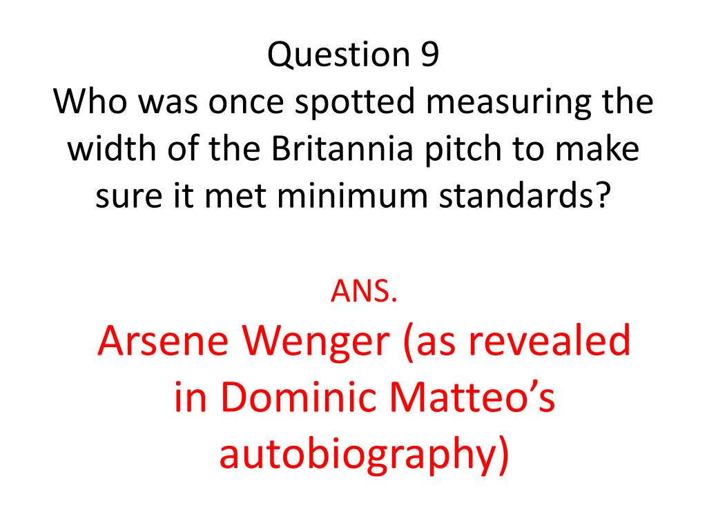 Question 9Who was once spotted measuring the width of the Britannia pitch to make sure it met minimum standards? ANS. Arsene Wenger (as revealed in Dominic Matteo’s autobiography)