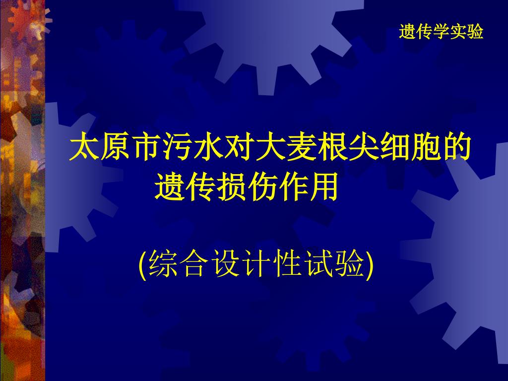 遗传学实验. 太原市污水 对大麦根尖细胞的 遗传损伤作用 (综合设计性试验 ). 实验目的 实验原理 材料 实验步骤 结果与分析. 实验目的. 了解污染物对细胞产生的遗传损伤 掌握微核测定的方法和微核形成的机制. 实验原理. 有关环境污染监测的方法,常见的有化学监测法和生物监测法。生物监测法不仅能够反映污染物的污染程度,更重要的是能够较准确、客观地反映污染物对真核细胞 DNA 分子损伤程度以及各污染物之间遗传毒性的拮抗或协同效应。. 实验原理.