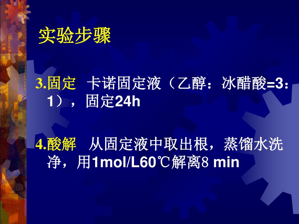 实验步骤 3.固定 卡诺固定液(乙醇:冰醋酸=3:1),固定24h 4.酸解从固定液中取出根,蒸馏水洗净,用1mol/L60℃解离8min