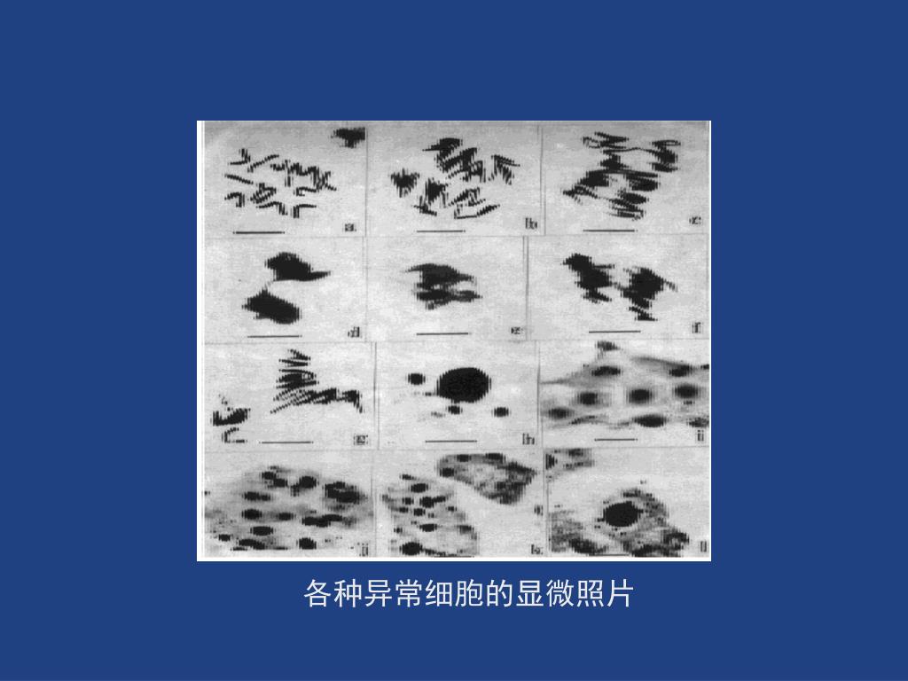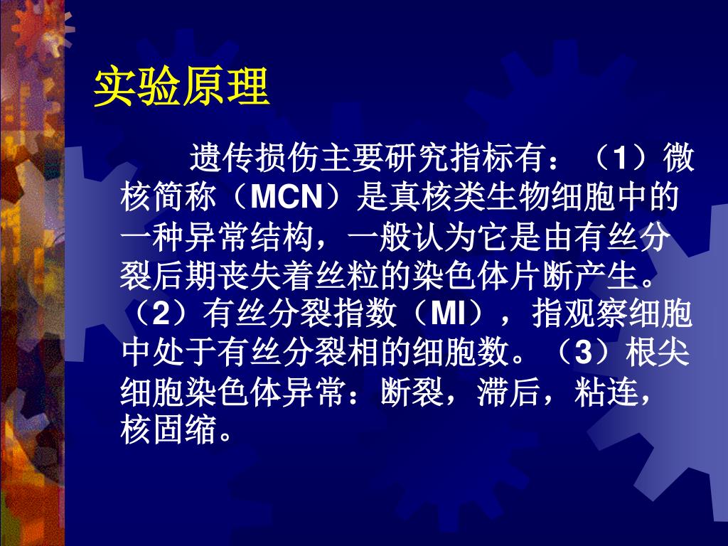 实验原理 遗传损伤主要研究指标有:(1)微核简称(MCN)是真核类生物细胞中的一种异常结构,一般认为它是由有丝分裂后期丧失着丝粒的染色体片断产生。(2)有丝分裂指数(MI),指观察细胞中处于有丝分裂相的细胞数。(3)根尖细胞染色体异常:断裂,滞后,粘连,核固缩。