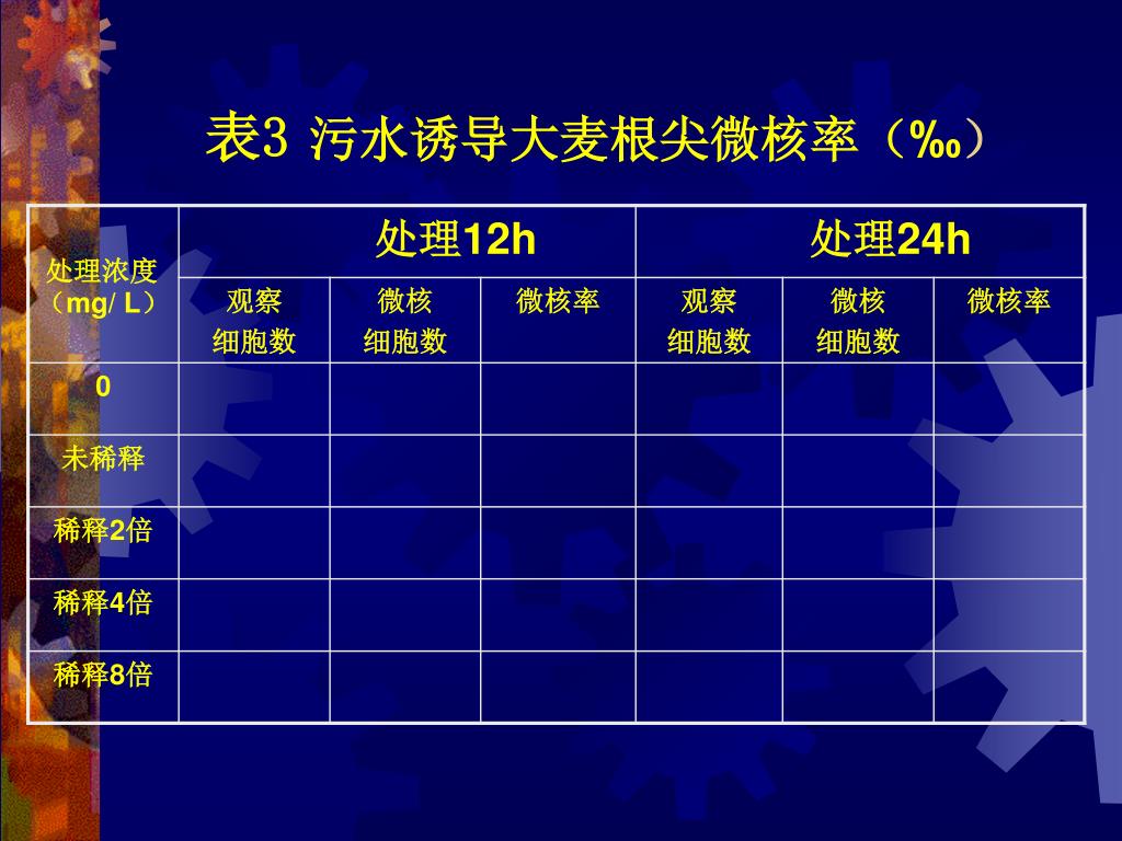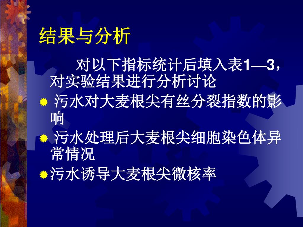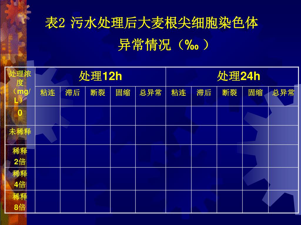 结果与分析 对以下指标统计后填入表1—3,对实验结果进行分析讨论 • 污水对大麦根尖有丝分裂指数的影响 • 污水处理后大麦根尖细胞染色体异常情况 • 污水诱导大麦根尖微核率