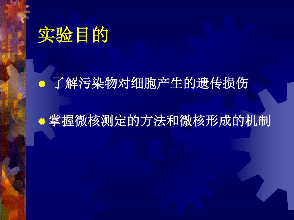 实验目的 • 了解污染物对细胞产生的遗传损伤 • 掌握微核测定的方法和微核形成的机制