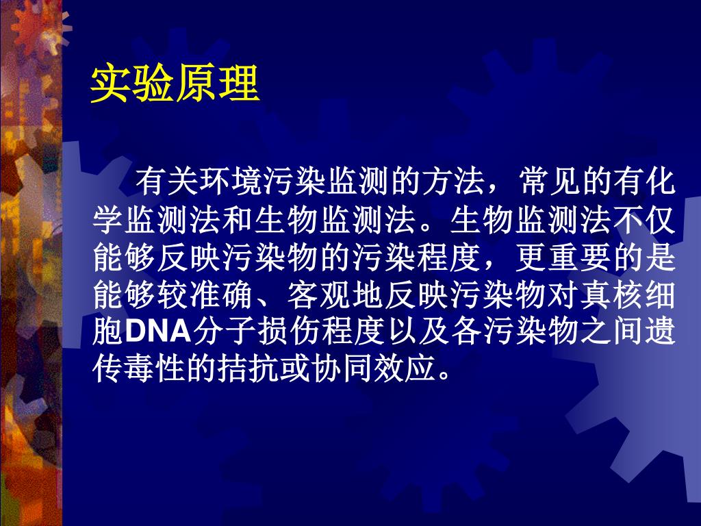 实验原理 有关环境污染监测的方法,常见的有化学监测法和生物监测法。生物监测法不仅能够反映污染物的污染程度,更重要的是能够较准确、客观地反映污染物对真核细胞DNA分子损伤程度以及各污染物之间遗传毒性的拮抗或协同效应。