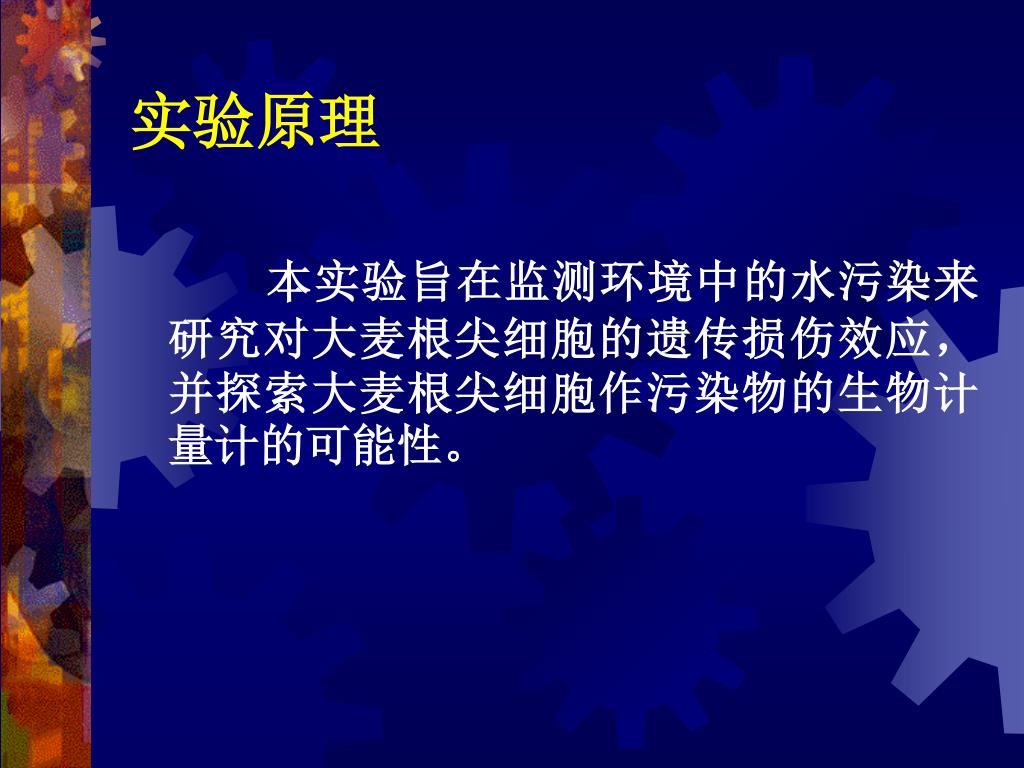 实验原理 本实验旨在监测环境中的水污染来研究对大麦根尖细胞的遗传损伤效应,并探索大麦根尖细胞作污染物的生物计量计的可能性。