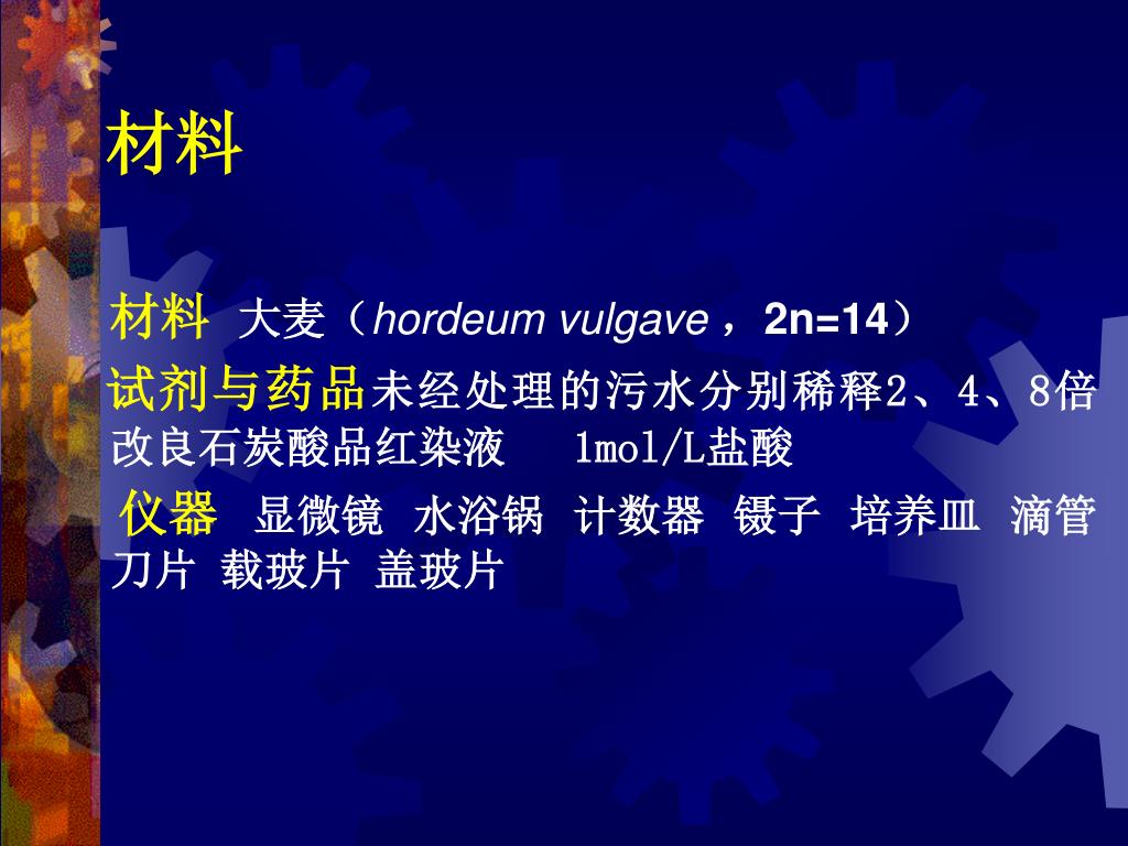 材料 材料大麦(hordeum vulgave,2n=14) 试剂与药品未经处理的污水分别稀释2、4、8倍 改良石炭酸品红染液 1mol/L盐酸 仪器显微镜水浴锅计数器镊子 培养皿滴管刀片 载玻片 盖玻片