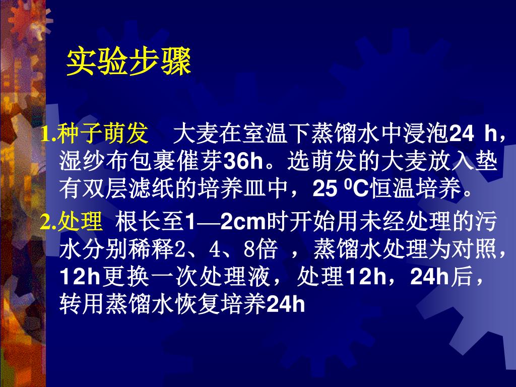 实验步骤 1.种子萌发大麦在室温下蒸馏水中浸泡24 h,湿纱布包裹催芽36h。选萌发的大麦放入垫有双层滤纸的培养皿中,25 0C恒温培养。 2.处理 根长至1—2cm时开始用未经处理的污水分别稀释2、4、8倍 ,蒸馏水处理为对照, 12h更换一次处理液,处理12h,24h后,转用蒸馏水恢复培养24h