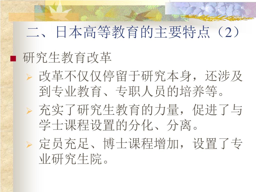 二、日本高等教育的主要特点(2) • 研究生教育改革 • 改革不仅仅停留于研究本身,还涉及到专业教育、专职人员的培养等。 • 充实了研究生教育的力量,促进了与学士课程设置的分化、分离。 • 定员充足、博士课程增加,设置了专业研究生院。
