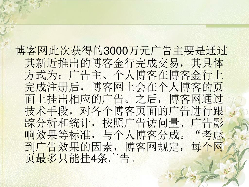 博客网获得3000万元广告 博客的发展已经进入了第三个阶段——实现商业价值。8月23日,博客网对外宣布获得3000万元广告,广告主分别为TCL集团、亚马逊卓越等。据博客网介绍,仅TCL集团就投入1000万元广告,亚马逊卓越所投广告约为数百万元,其他广告主投入1000多万元,共计3000万元。