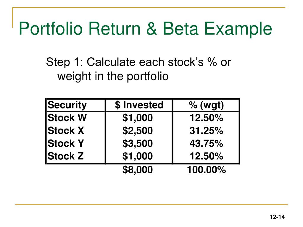 Portfolio Return & Beta Step 3: Apply the weights to each stock’s beta to arrive at the portfolio’s beta.