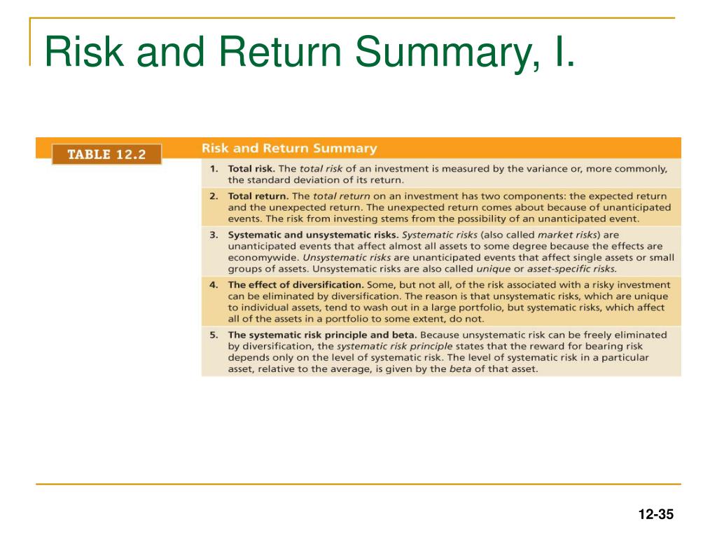 Systematic Risk “Unsystematic risk is essentially eliminated by diversification, so a portfolio with many assets has almost no unsystematic risk.” “The systematic risk principle states that the reward for bearing risk depends only on the systematic risk of an investment.” “The expected return on an asset depends only on its systematic risk.”